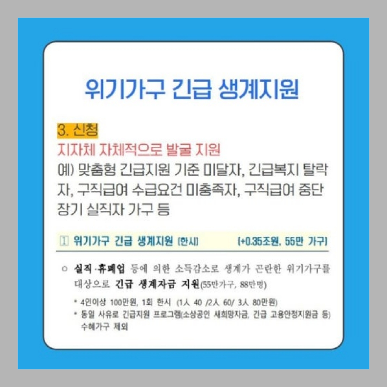 - 긴급생계지원금은 한시적인 지원이므로, 장기적인 생계 대책 마련이 필요합니다.